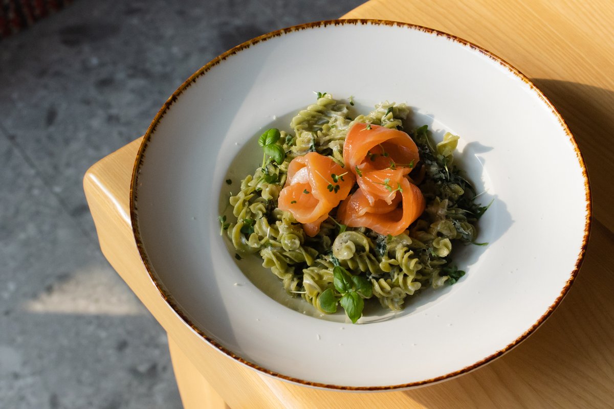 Fusili od špinata bez glutena sa soljenim lososom i kremastim sosom.