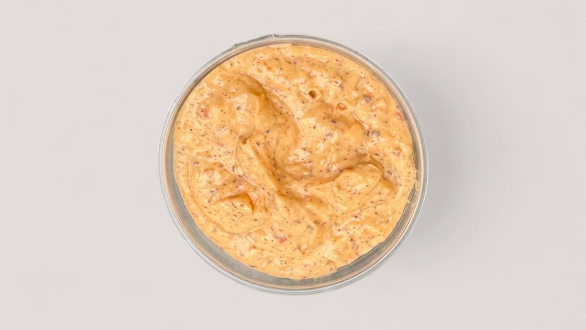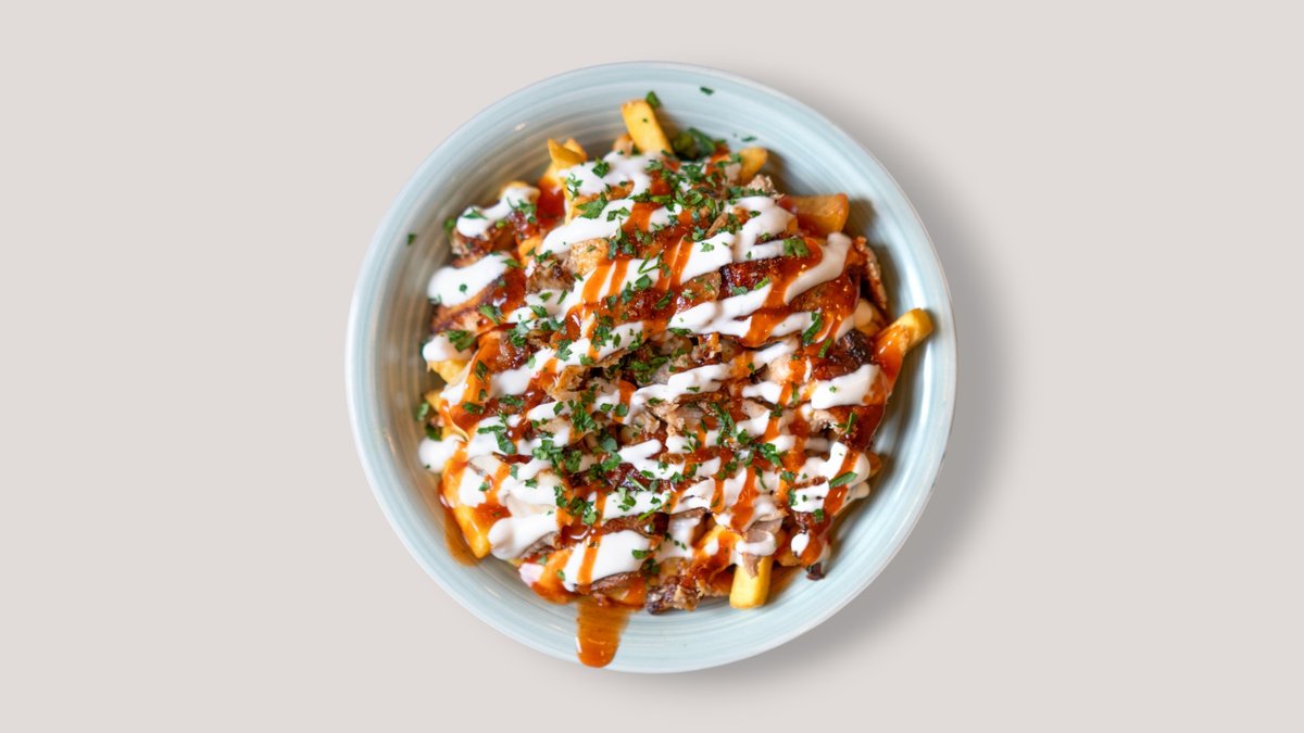 činija punjena hrskavim pomfritom i pilećom šavarmom, prelivena sosom od belog luka i majoneza, čilijem i začinima