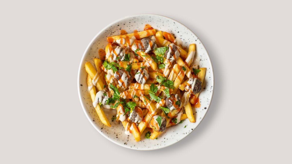 činija punjena hrskavim pomfritom i 100% goveđom kaftom, prelivena tahinijem, čilijem i začinima