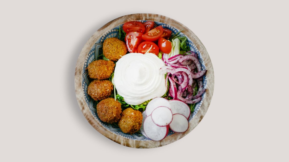 Tradicionalni libanski falafel u lavašu, sa paradajzom, peršunom, kiselim krastavcima i tahinijem — obogaćen humusom, svežom nanom, rotkvicama i karfiolom za dodatni ukus