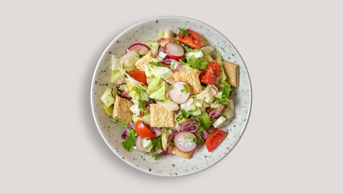 Ukusna libanska mešavina peršuna, sumak-luka, nane, krastavca, rotkvica, zelene salate, čeri paradajza, rukole, zelene paprike i krekera. Pomešana sa fatuš dresingom. Veganski (233 kcal)