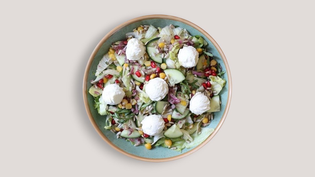 miks svežih zelenih salata u kombinaciji sa kuvanim leblebijama, krastavac, nar, semenke suncokreta, sumak luk i feta sir. Pomešano sa limun senf dresingom (418kcal)