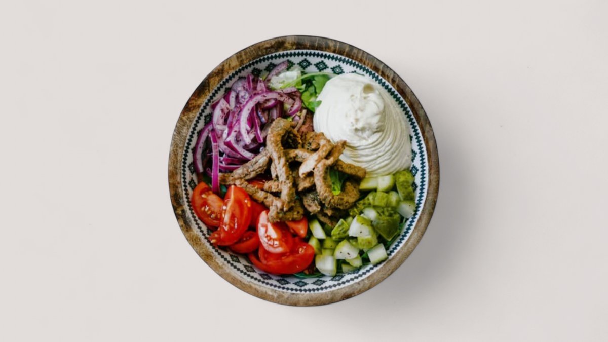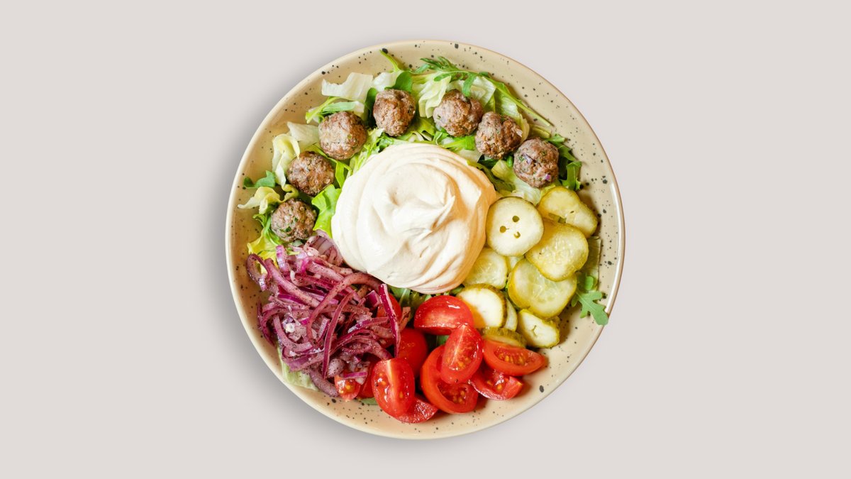 Goveđa šavarma u činiji sa miksom zelene salate, čeri paradajz, kiseli krastavci, sumak luk i humus. Pomešano uz limun senf dresing (324kcal)