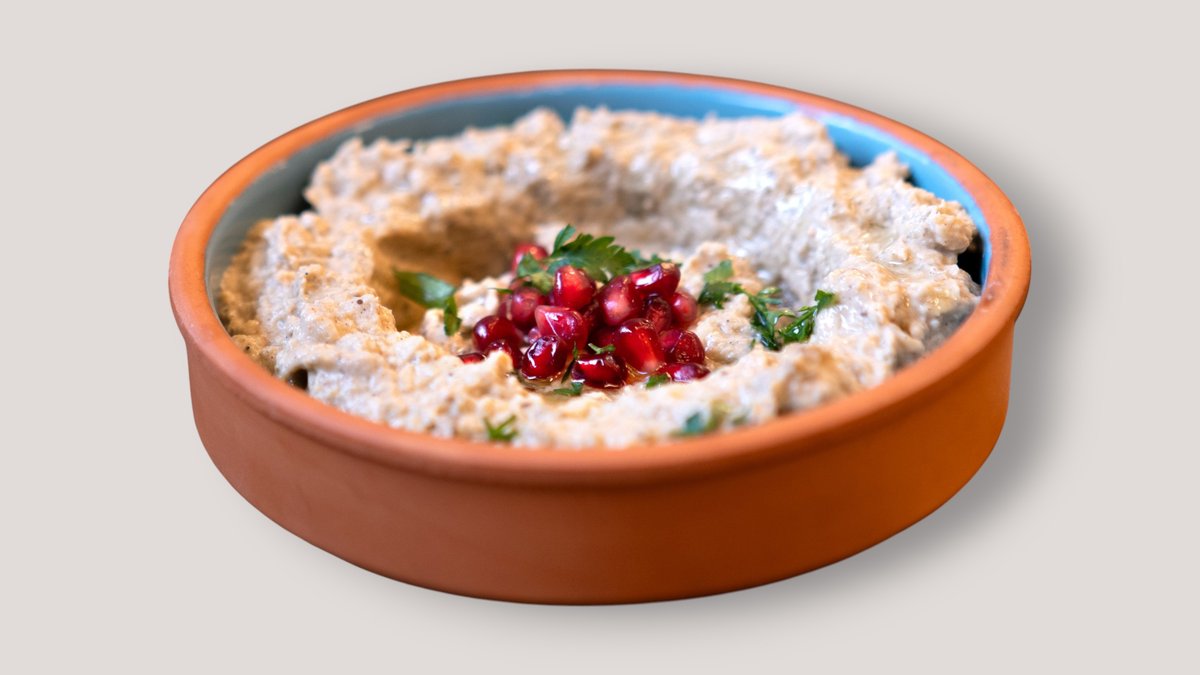 Nagrađivan libanski umak od pečenog patlidžana i tahinija - istinska mediteranska ljubav, poslužen sa peršunom, narom, maslinovim uljem i hrskavim krekerima