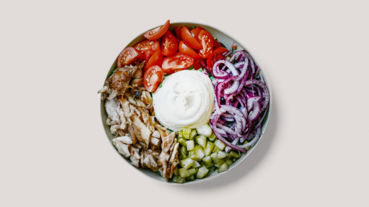 pileća šavarma u činiji sa miksom zelene salate, čeri paradajz, kiseli krastavci, sumak luk i humus. Pomešano uz limun senf dresing (299kcal)