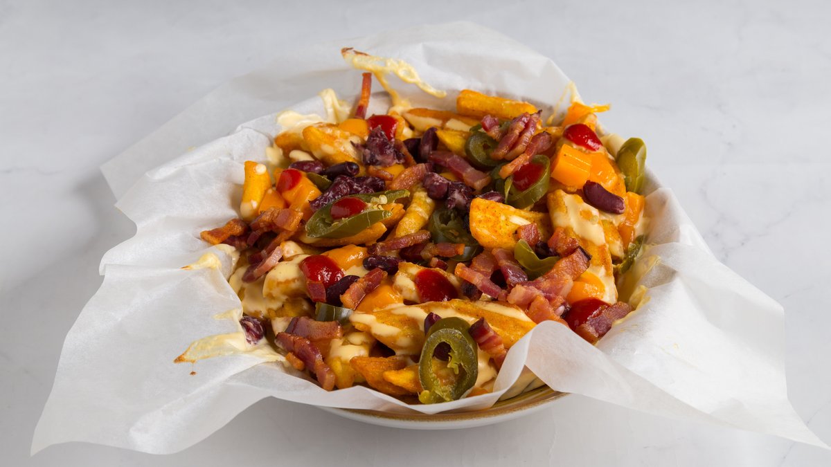 Texas-Mexico vajb, debelo rezane kriške hrskavog krompira zapečene sa ljutim paprikama, sirom, crvenim pasuljem i slaninom pa prelivene sriracha sosom i cedar umakom