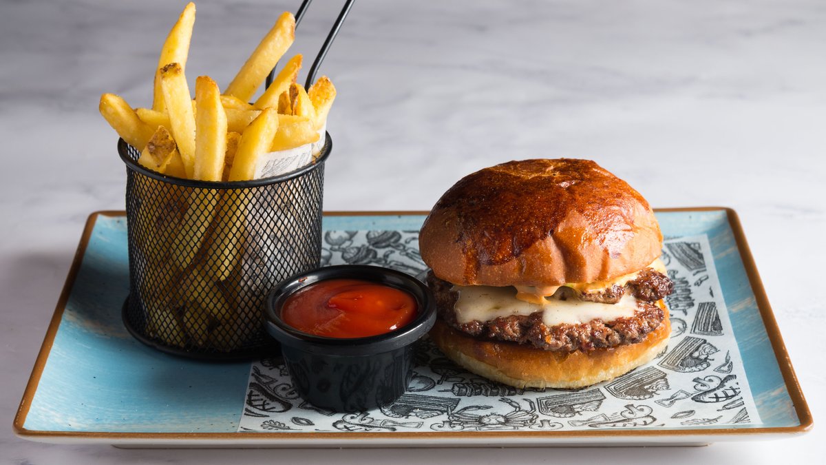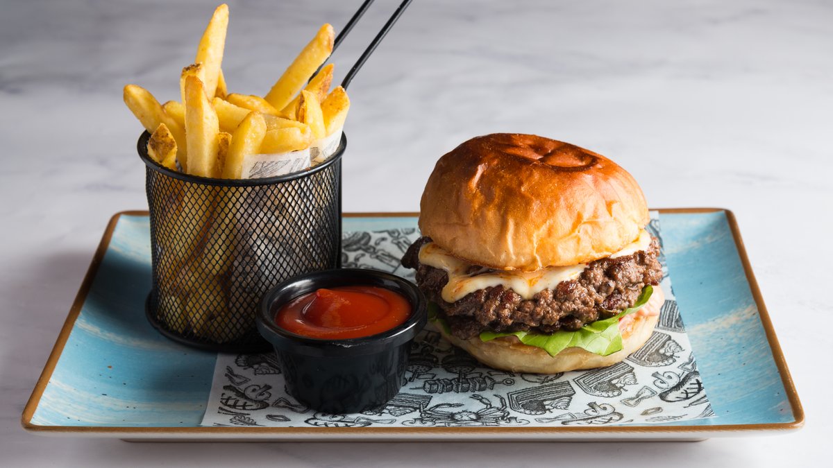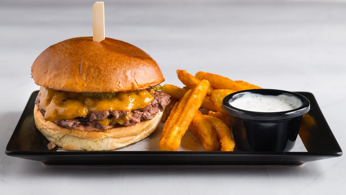-Puterasta zemička, 160g sočne mlevene junetine, topljeni chedar, burger sos i kiseli krastavčić u sredini