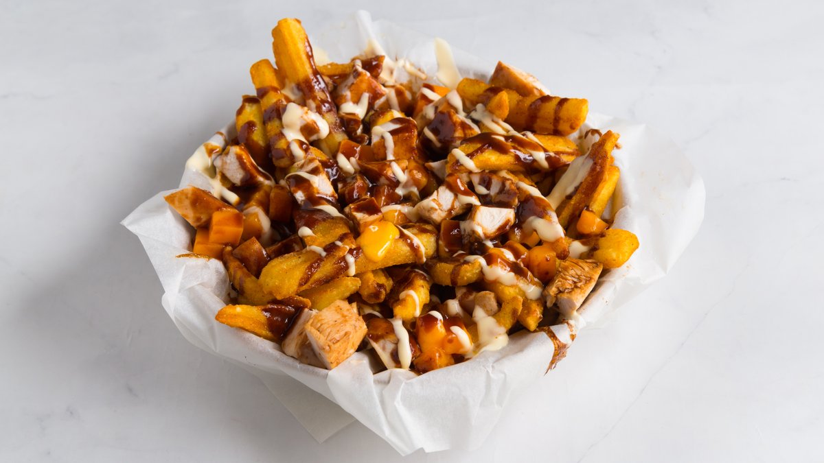 -Debelo rezane kriške hrskavog krompira pržene, pa zapečene sa BBQ Piletinom, kockicama chedara, BBQ sosom i chedar sosom