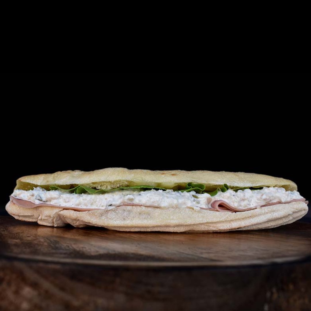 Sendvič sa šunkom, topljenim sirom i kremastom salatom na bazi piletine, prženog susama, majoneza, pavlake i blagim dodatkom kiselog krastavca.