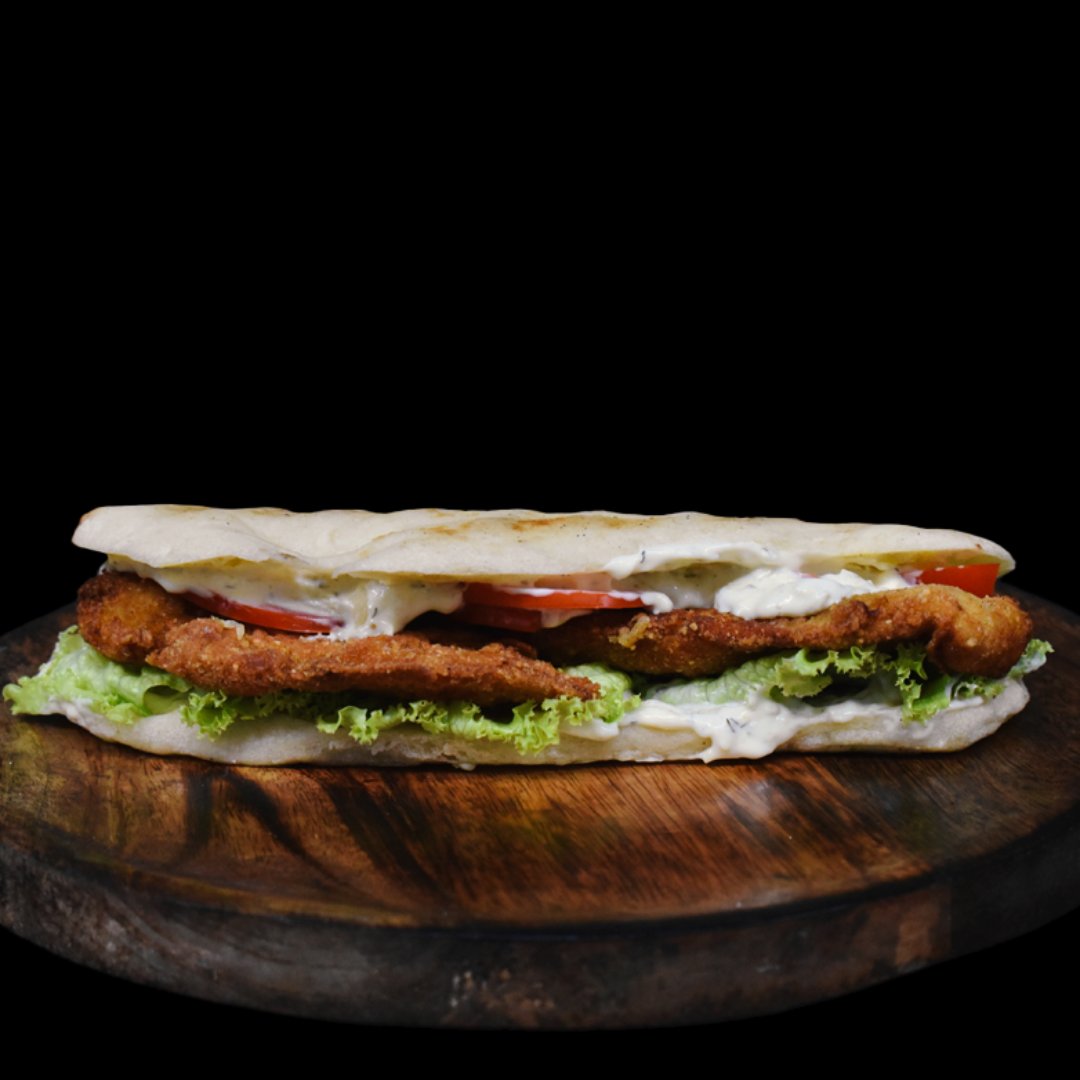 Sendvič sa pohovanim belim mesom, tartar salatom, paradajzom i zelenom salatom.