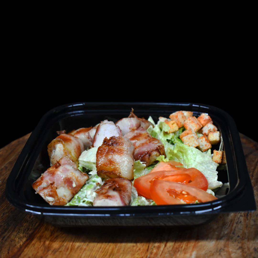 Zelena salata sa cezar dresingom, sočni pileći ražnjići rolovani u hrskavoj slanini i urnebes krutoni.
