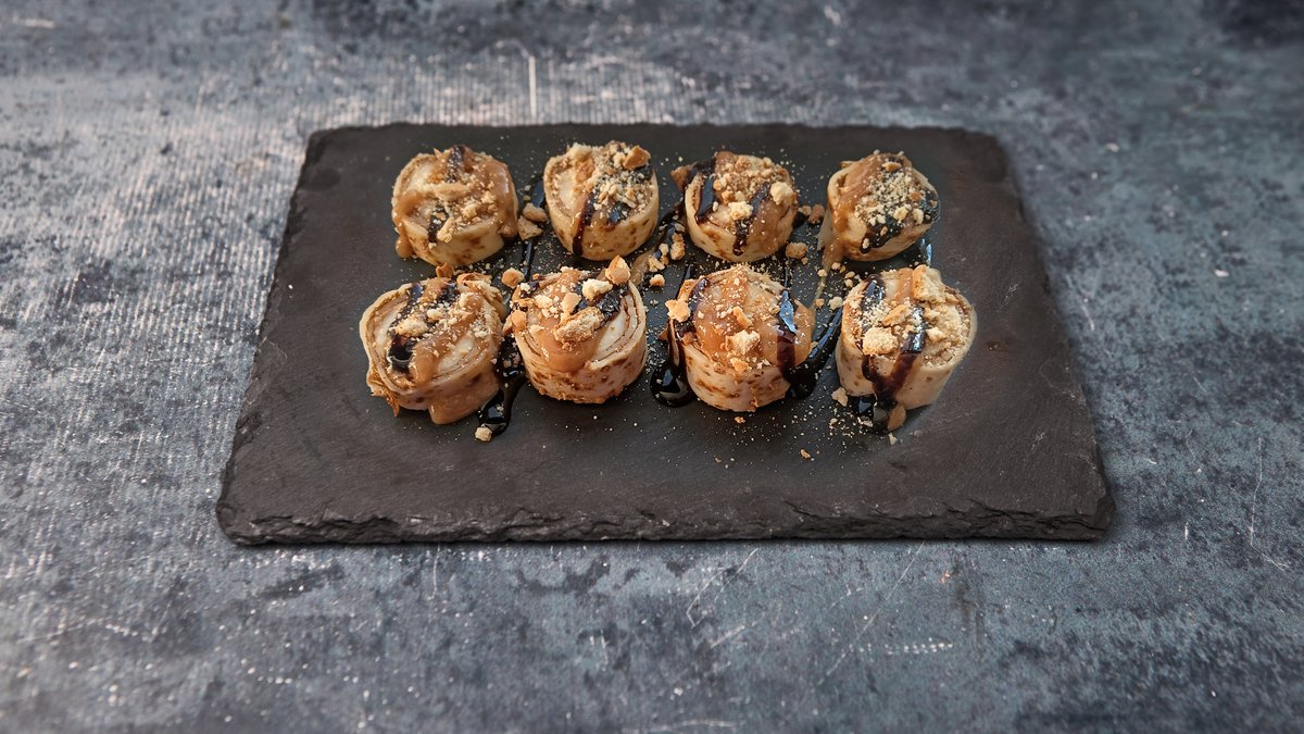 Domaća rolana palačinka, pečena u tiganju i sečena na kolutiće. Filovana kikiriki puterom i celom bananom... Prelivena topingom od karamele i posuta krupnije mlevenom plazmom. Jedna malo interesantnija varijanta već dobro poznate poslastice, koja svojim izgledom podseća na Sushi. Prijatno!