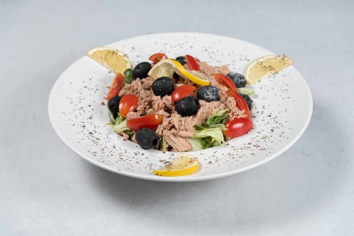 Mix salata, maslinovo ulje, zacini, tuna 180gr, cherry paradajz, masline