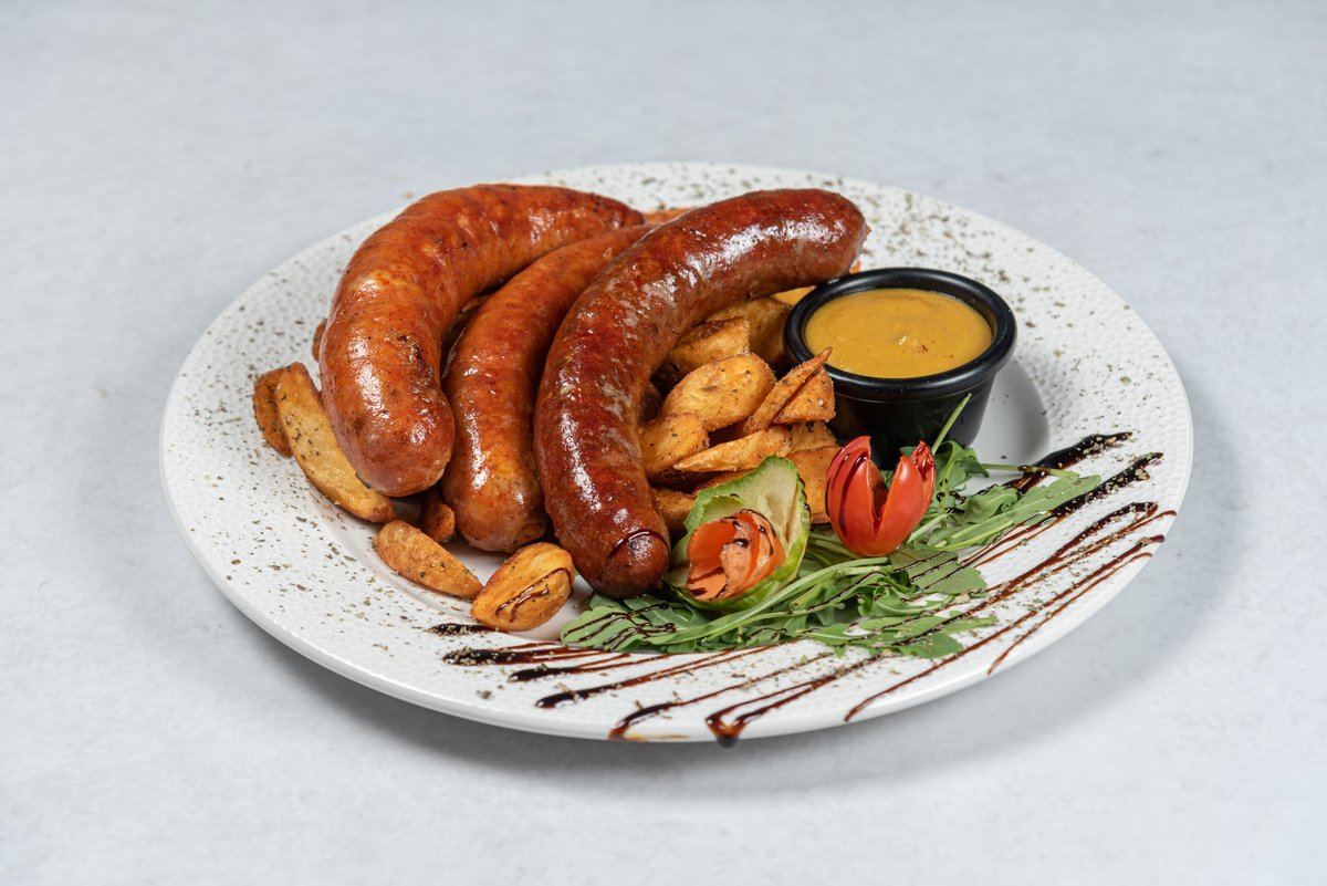300gr konjskih kobasica, wedges, honey mustard, somun