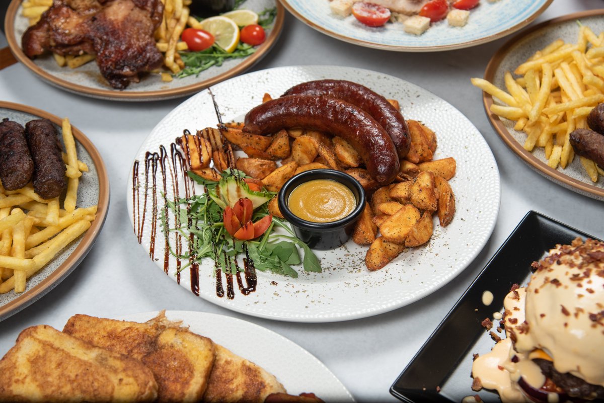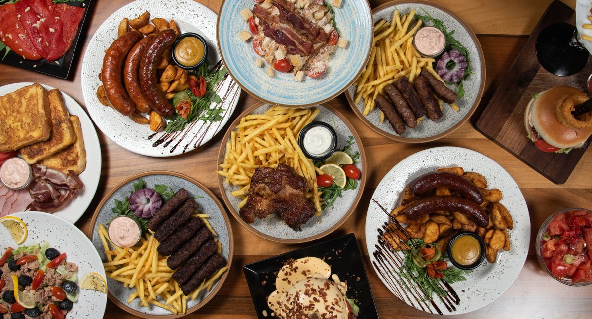 200gr dry aged juneceg mesa, sezonsko povrce, cheddar sir, panceta, burger sos, 200gr pomfrita. Preliv od cheddar sira. Preliv se pakuje zasebno.