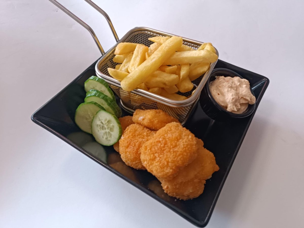 7 pilećih medaljona + pomfrit 150gr + sos, krastavac