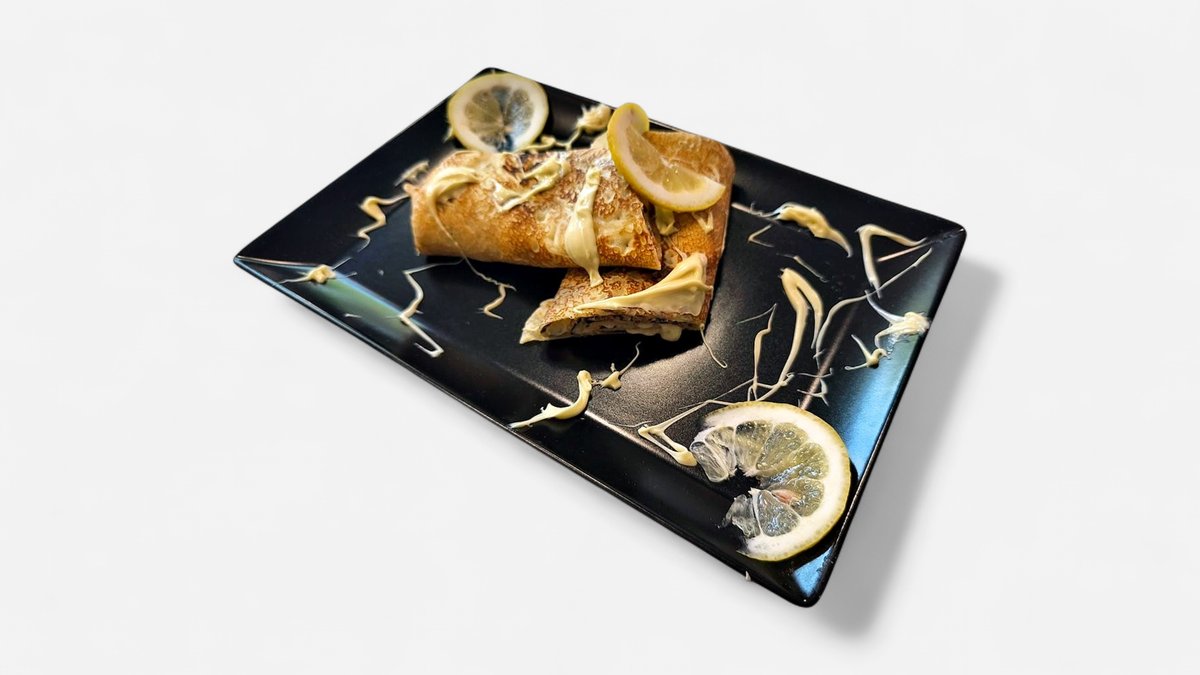 Vratna kremenadla na žaru, čedar sos, kiseli krastavci, luk