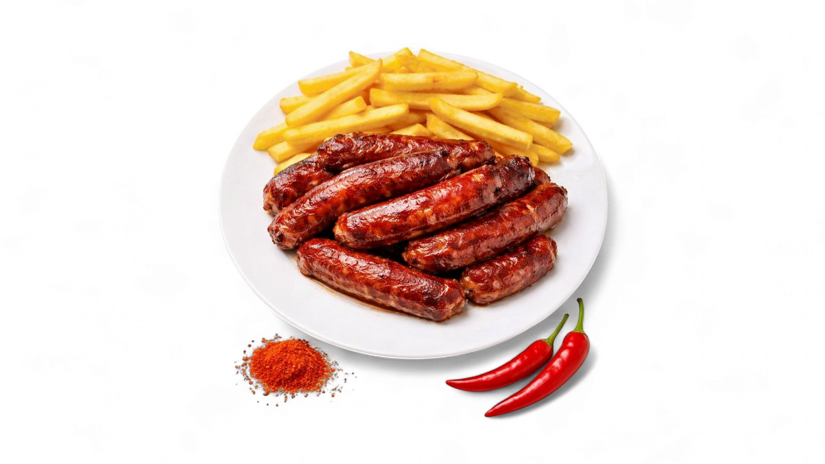 Juneći ćevapi sa lukom (10 komada) i pomfrit 300g.