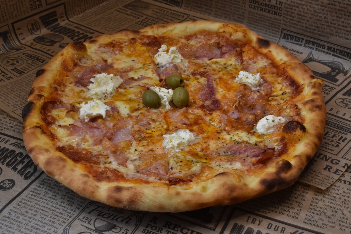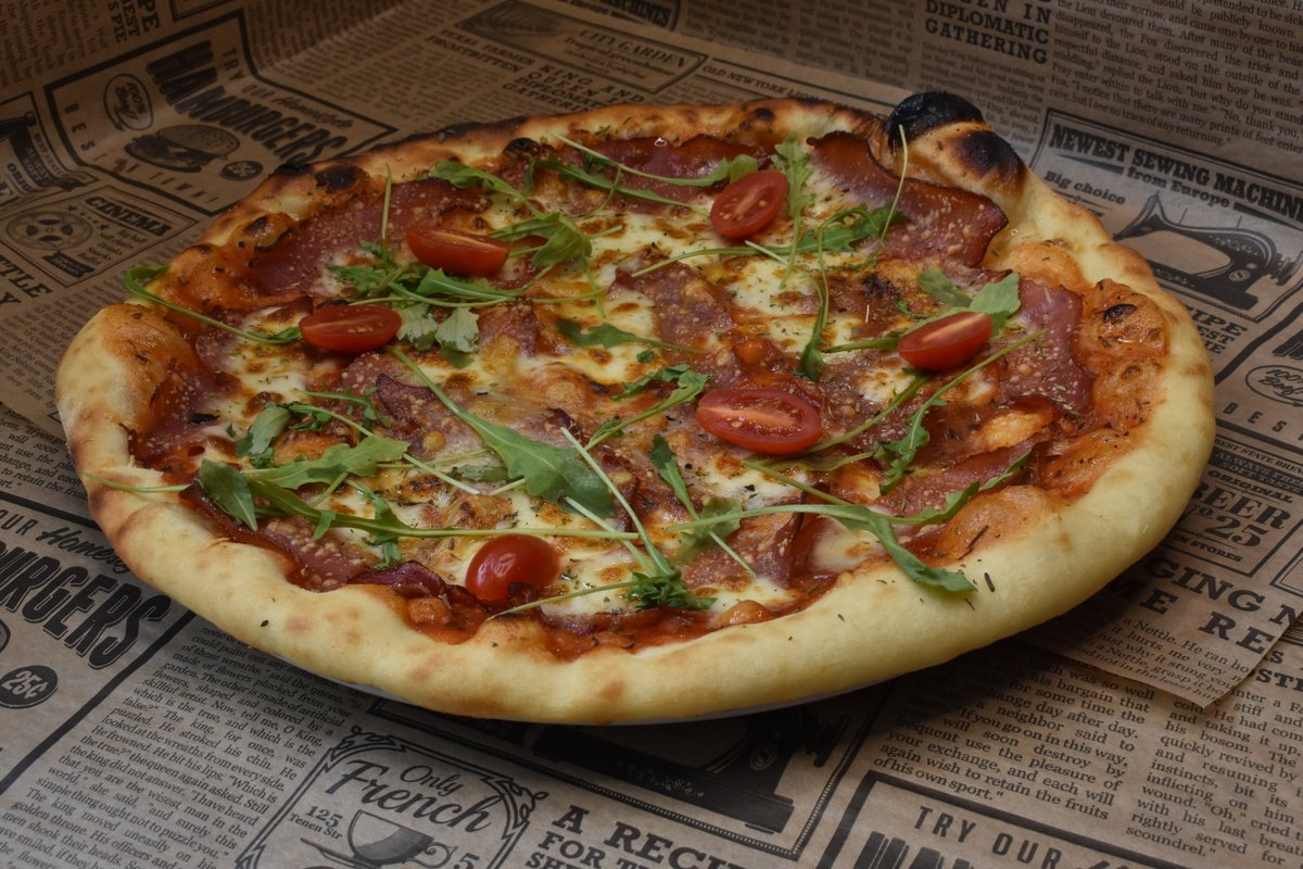 Domaća lepinja 180g, Suvi vrat, kačkavalj, kajmak, paradajz, rukola, beli luk
