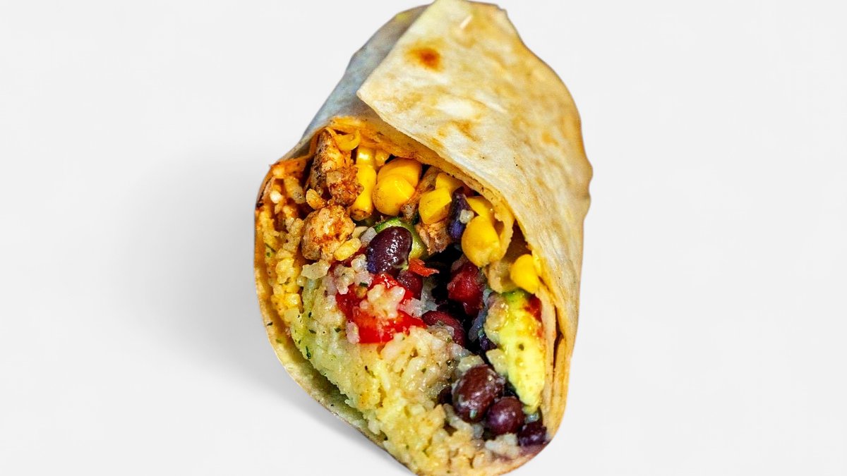 Pirinač, grilovano belo meso, crni pasulj, kukuruz, paradajz, krastavac, gvakamole, sos po izboru, svež krastavac