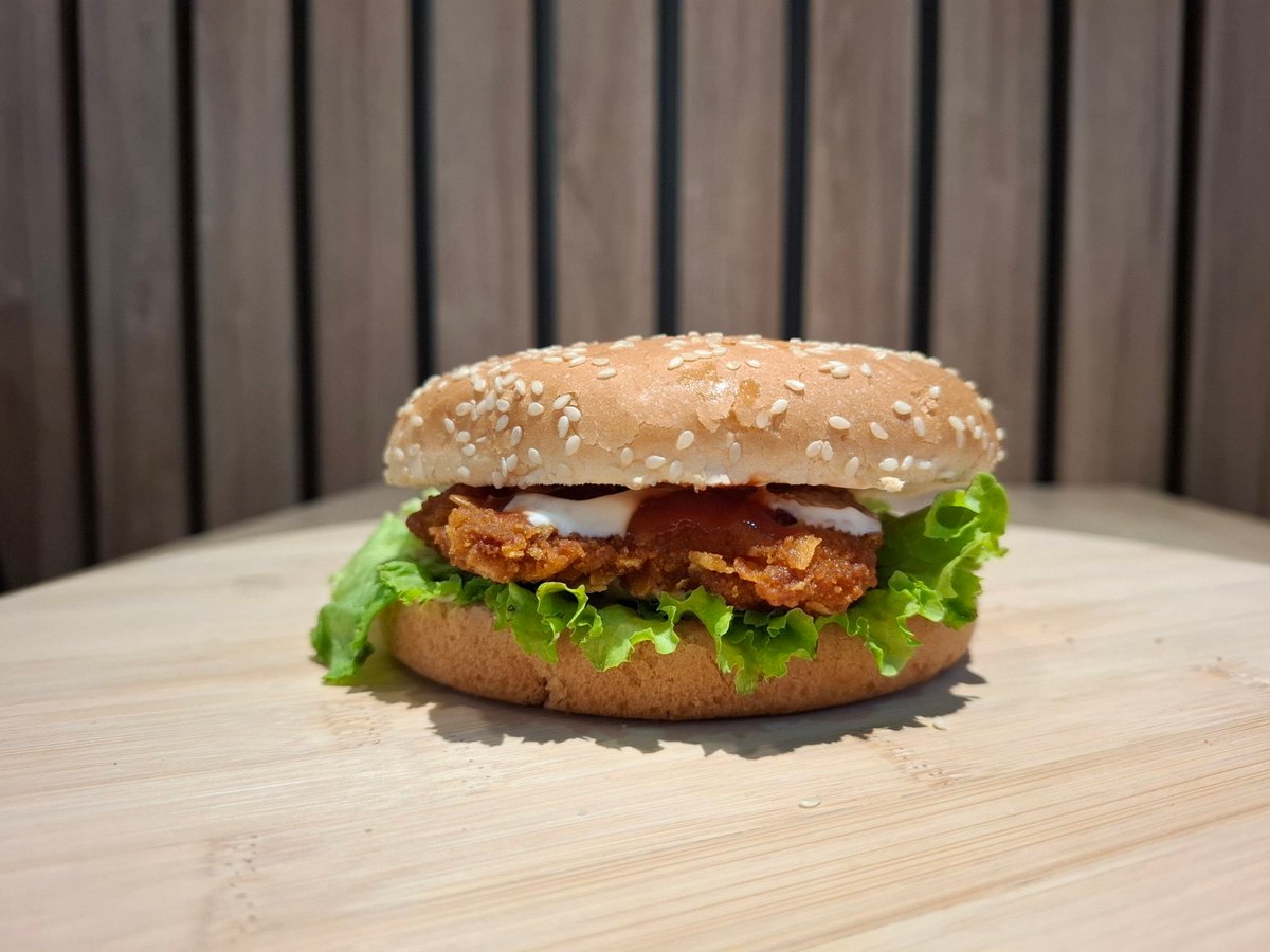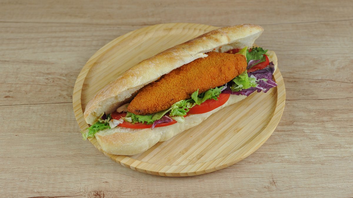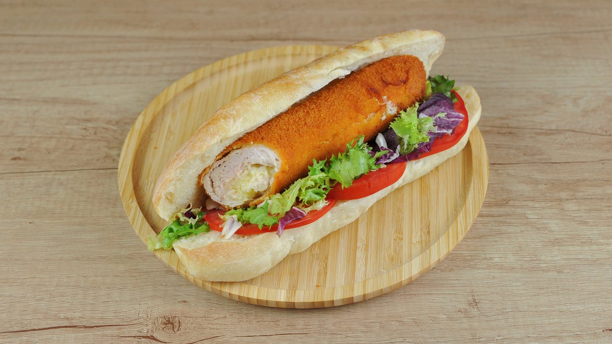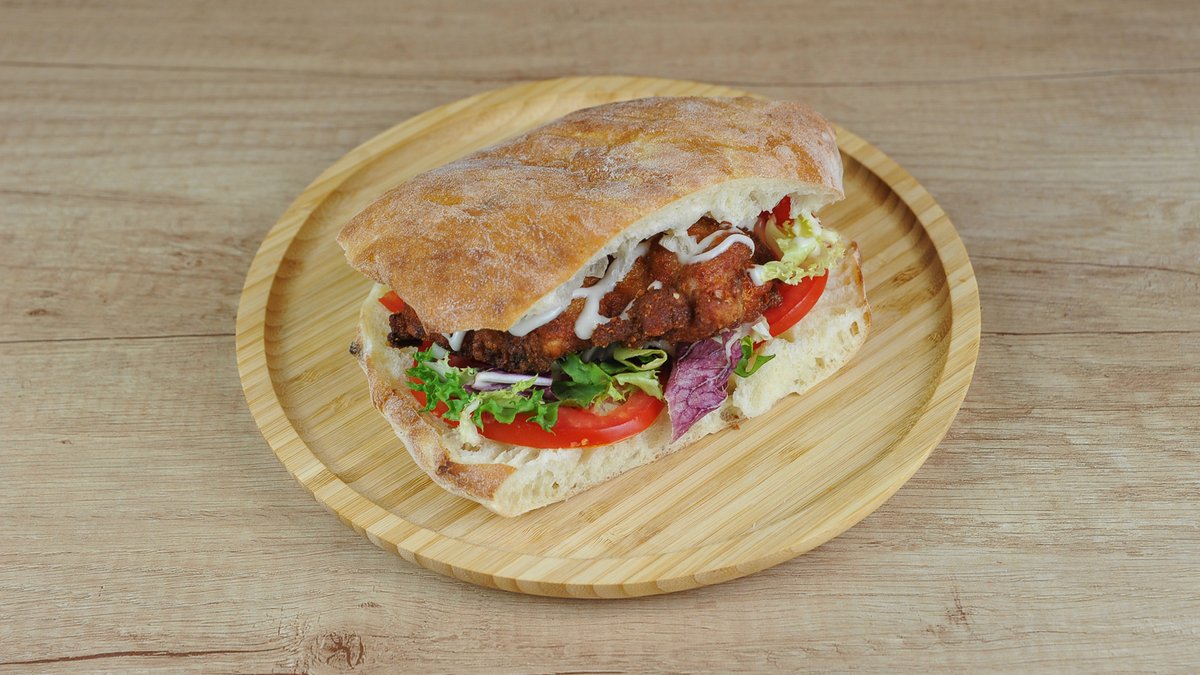 70gr začinjeno belo meso, 70gr pomfrit Prilozi: pavlaka, majonez, kečap, senf, paradajz, krastavac, zelena salata, luk, kiseli krastavčići