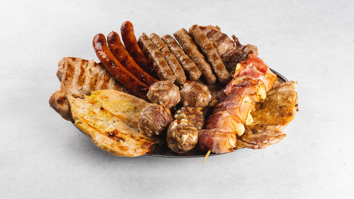Pileće belo meso, pileći batak, uštipci, ljuti uštipak, ćevapi, svinjski vrat, kobasice, slanina, ražnjić.