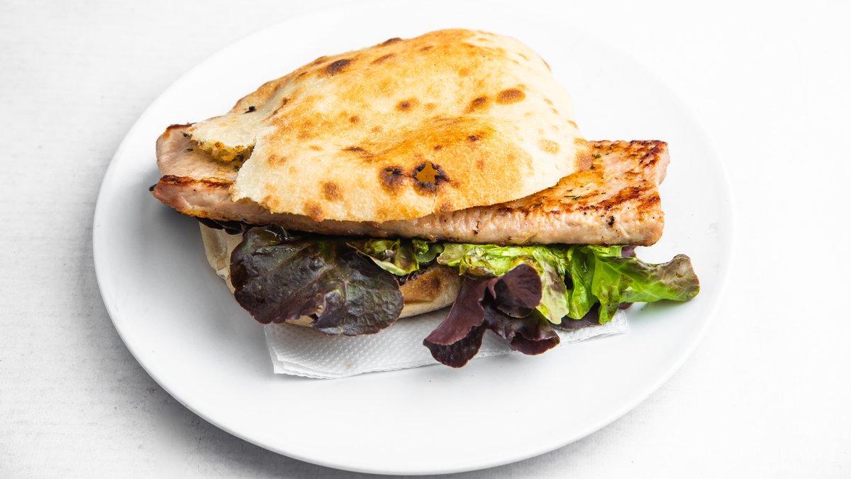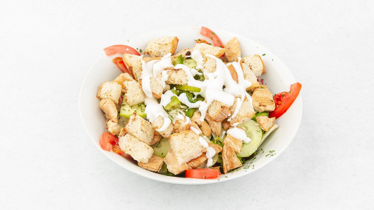 Zelena salata, krutoni, paradajz, belo meso, slanina, dresing.