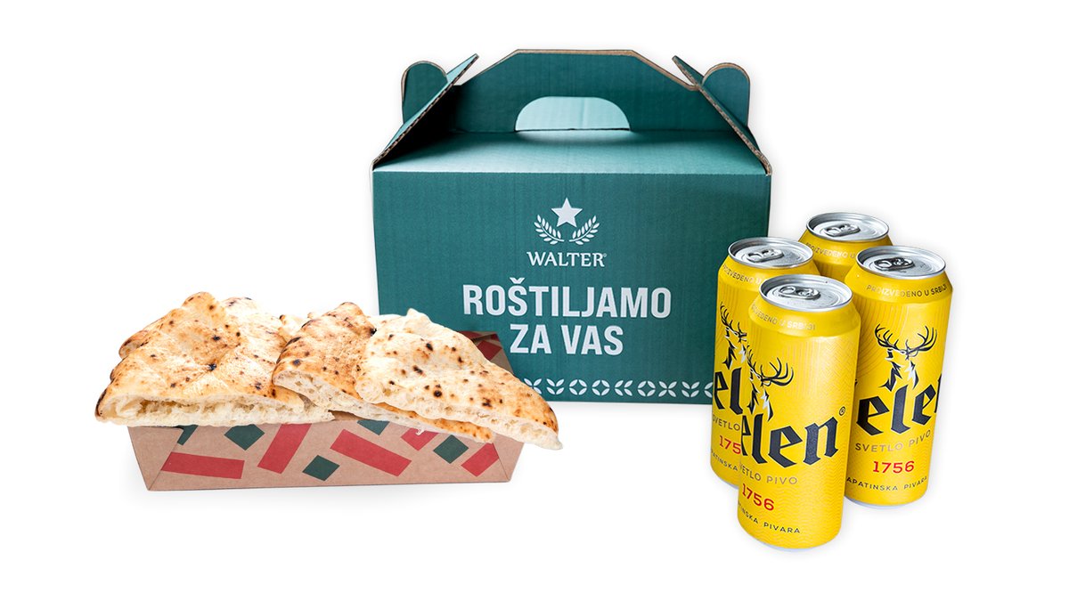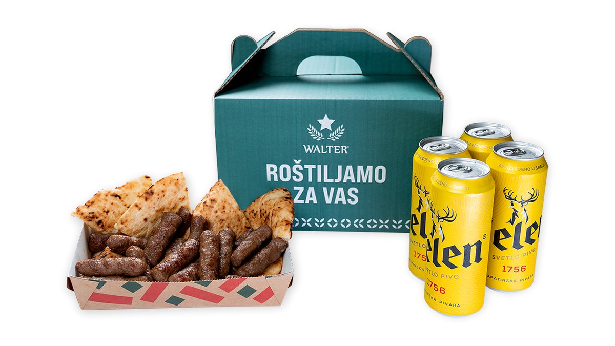 40 svežih ćevapa od čistog junećeg mesa, 2 somuna, luk, tucana paprka, 4 jelen piva