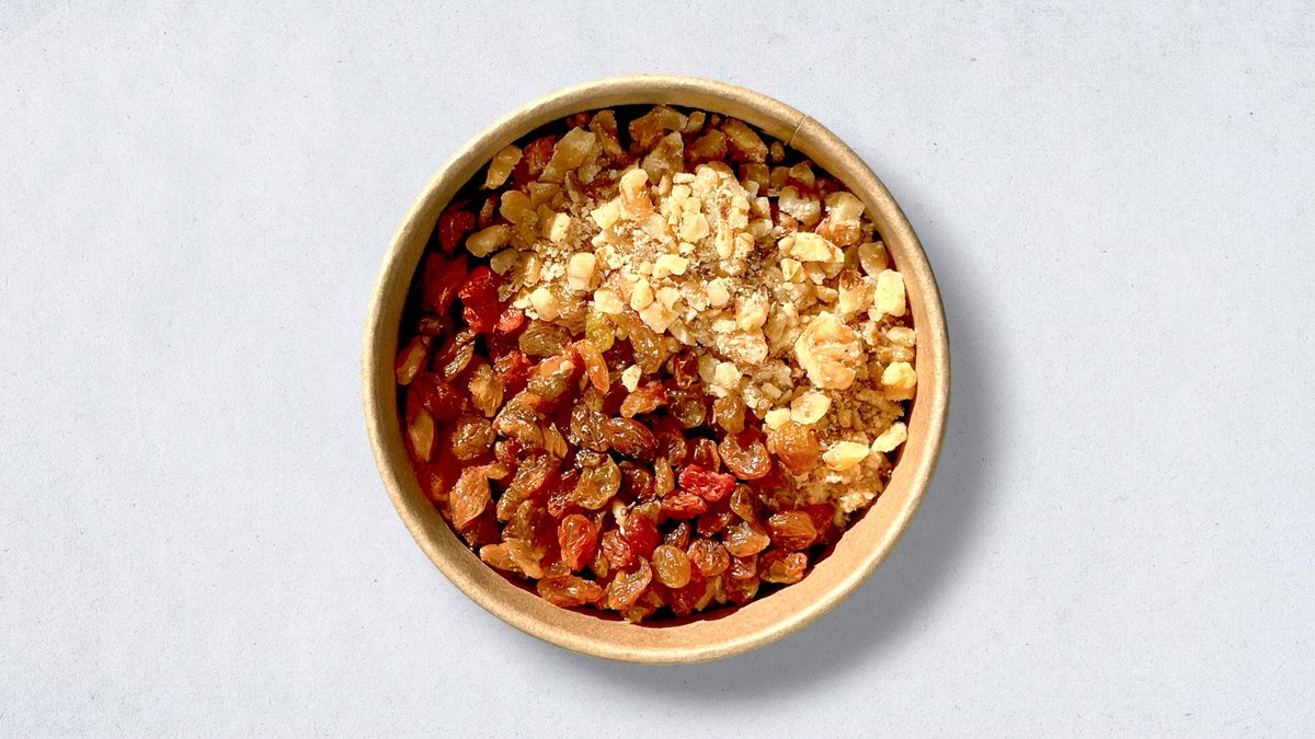 25g. Pistaći, badem, urme, sok od pomorandže, kako, cimet.