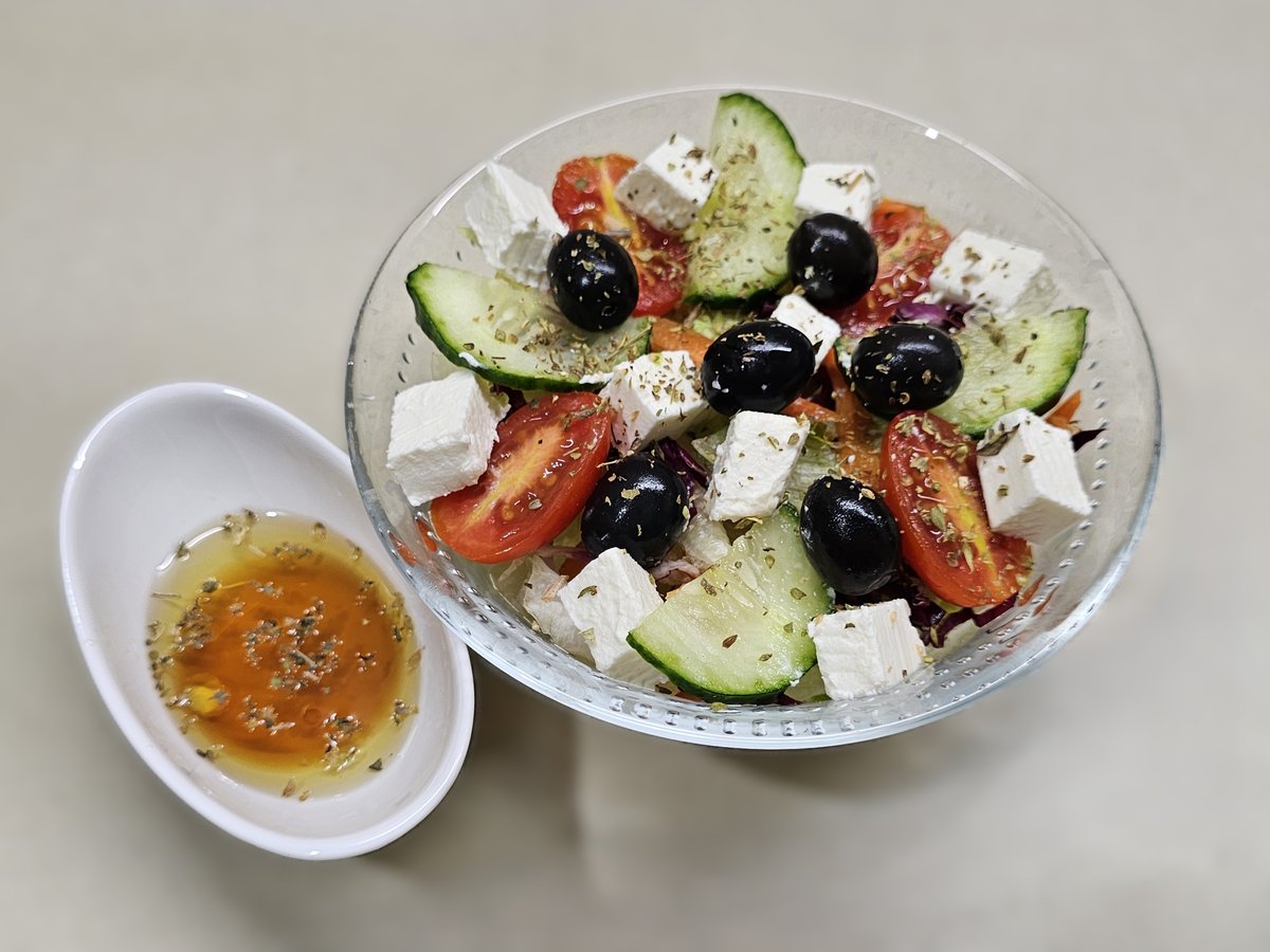 Iceberg salata, radič, šargarepa, čeri, krastavac, feta sir, masline, origano, preliv sa maslinovim uljem
