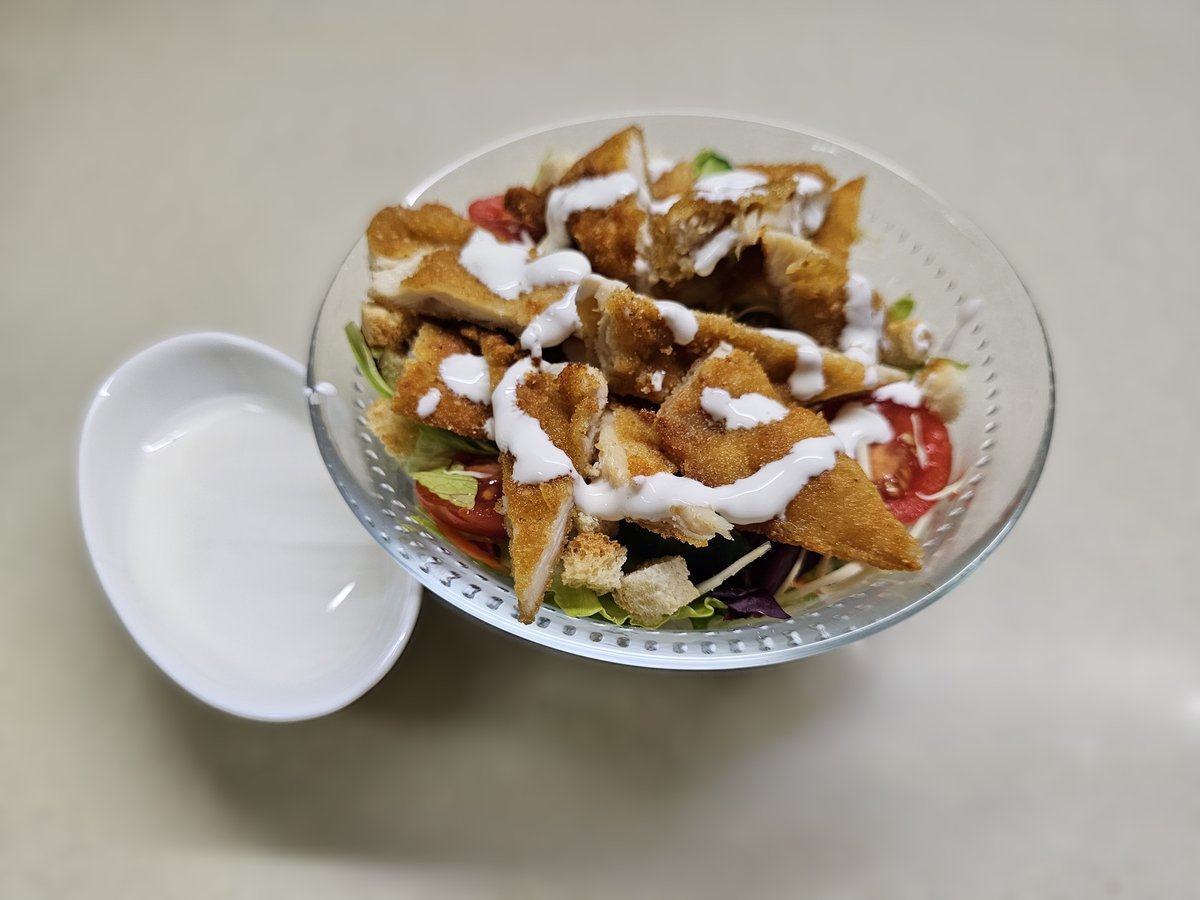 Pohovana piletina, iceberg salata, radič, šargarepa, čeri, krastavac, kačkavalj, krutoni, beli preliv