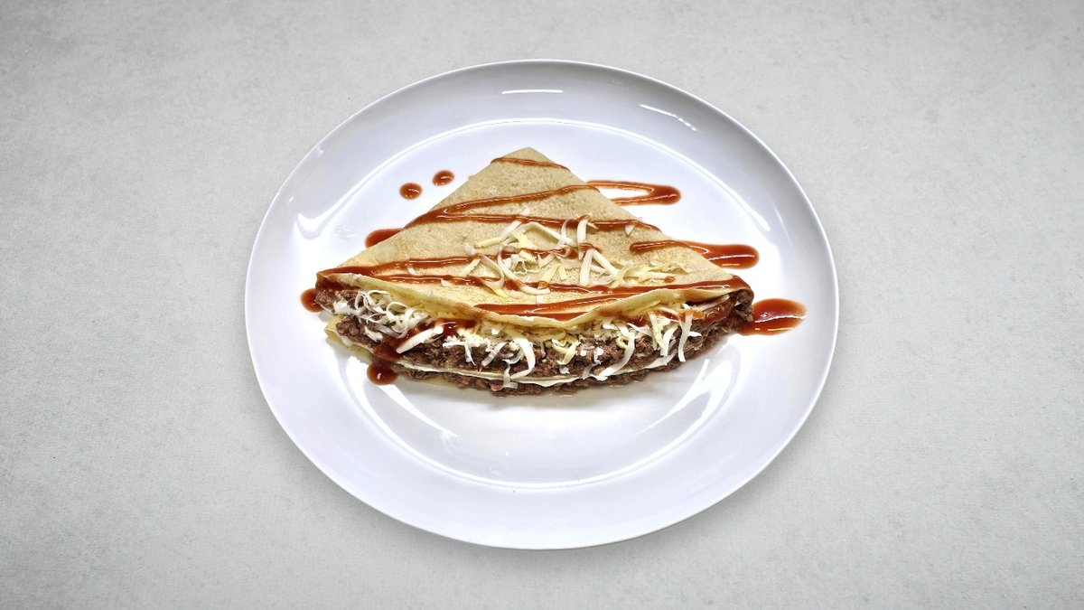Juneće meso, kačkavalj, kukuruz, crveni pasulj, paradajz, crvena paprika, luk, iceberg salata, beli preliv