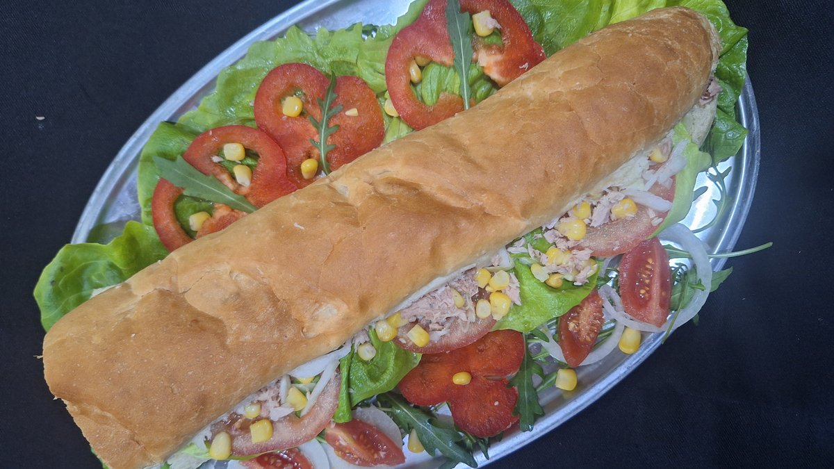 330g, Tunjevina, kukuruz, zelena salata, posni majonez, francuski hleb