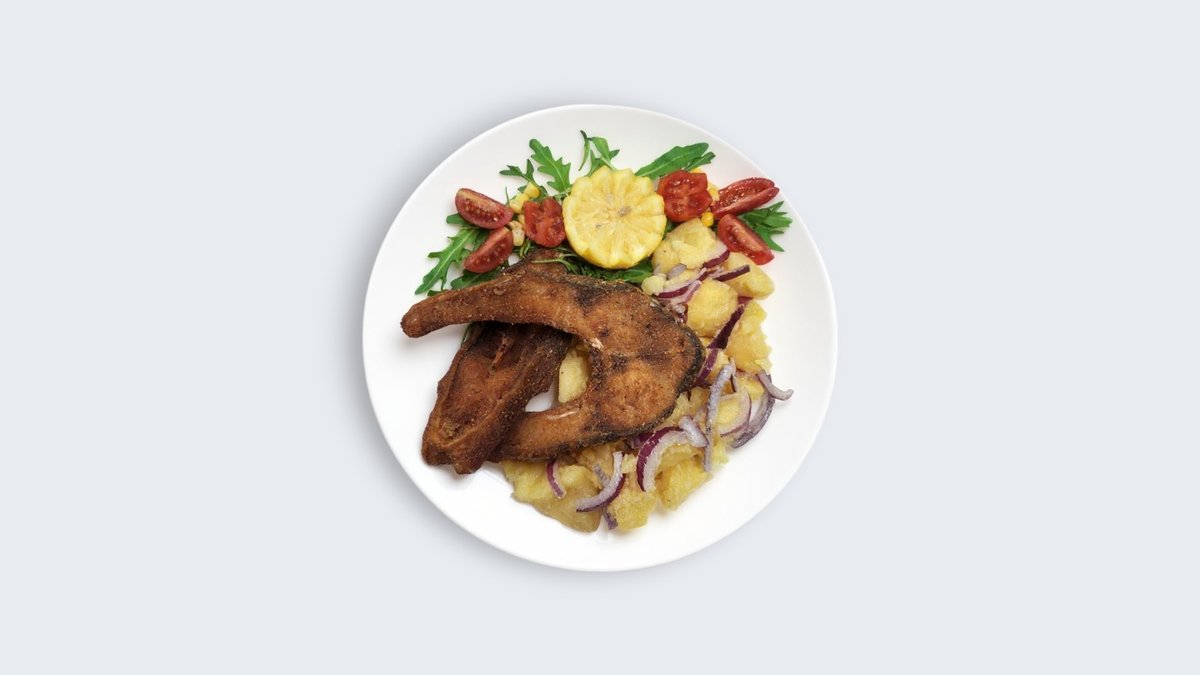 Kotleti šarana 300g, krompir salata 250g, limun 1/4