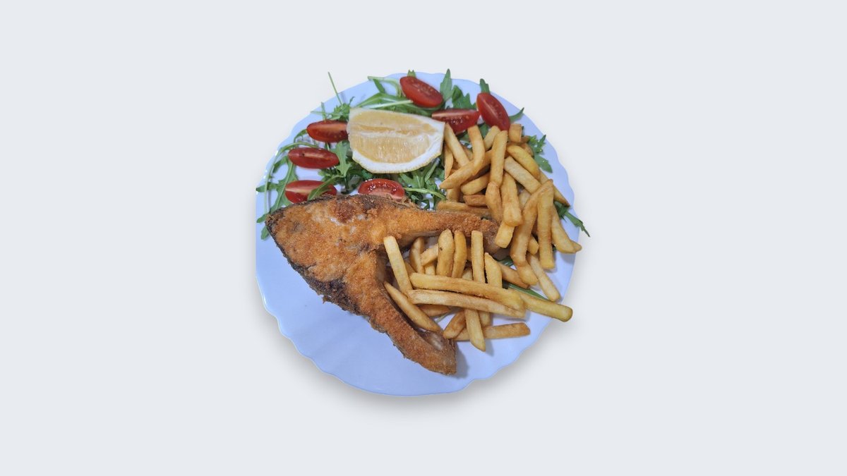 Kotleti šarana 300g, pomfrit 250g, 1/4 limun