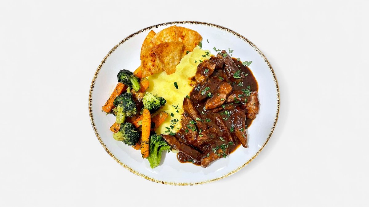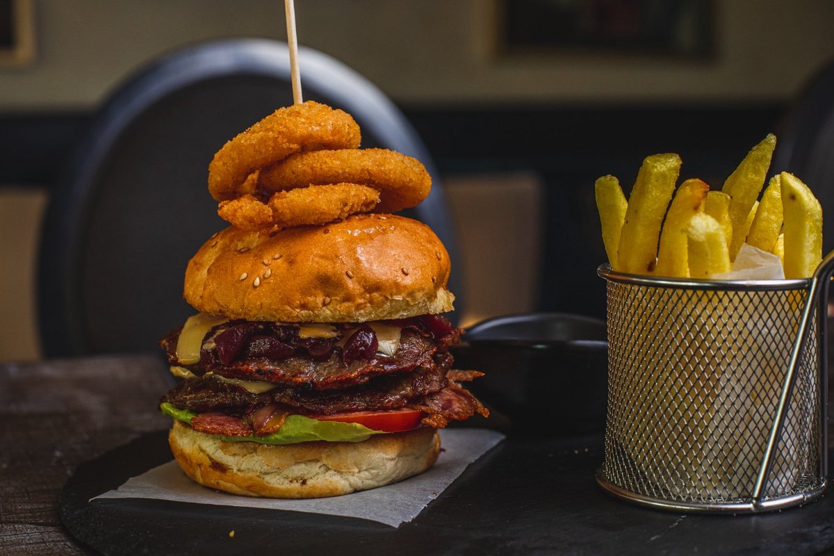 Junece meso, slanina, sir, paradajz, kiseli krastavac, luk, pomfrit, pohovani kolutovi luka