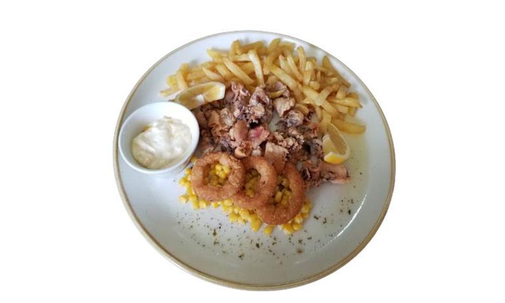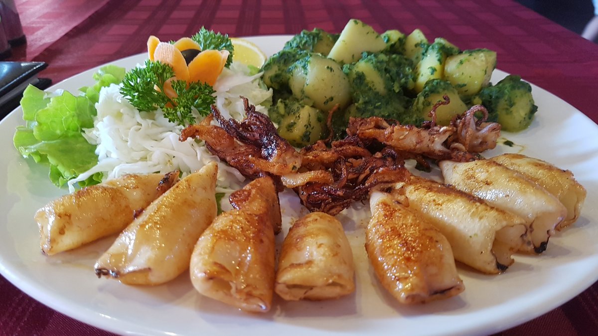 Prženi kolutići lignji sa barenim krompirom sa spanaćem i marinadom