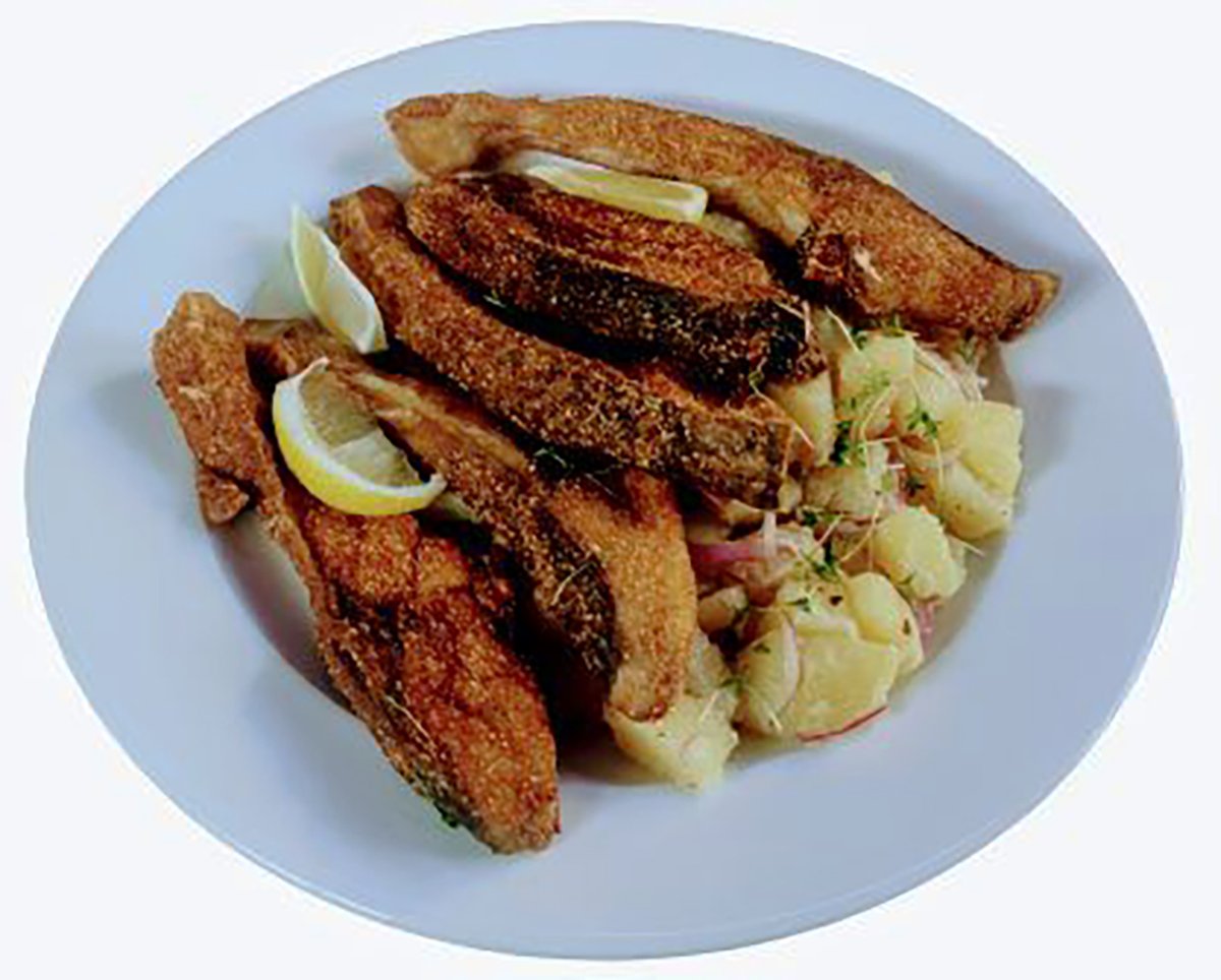 Filetirani šaran 100g i filetirani som 100g, posuda 500 ml, služi se sa domaćim posnim testom