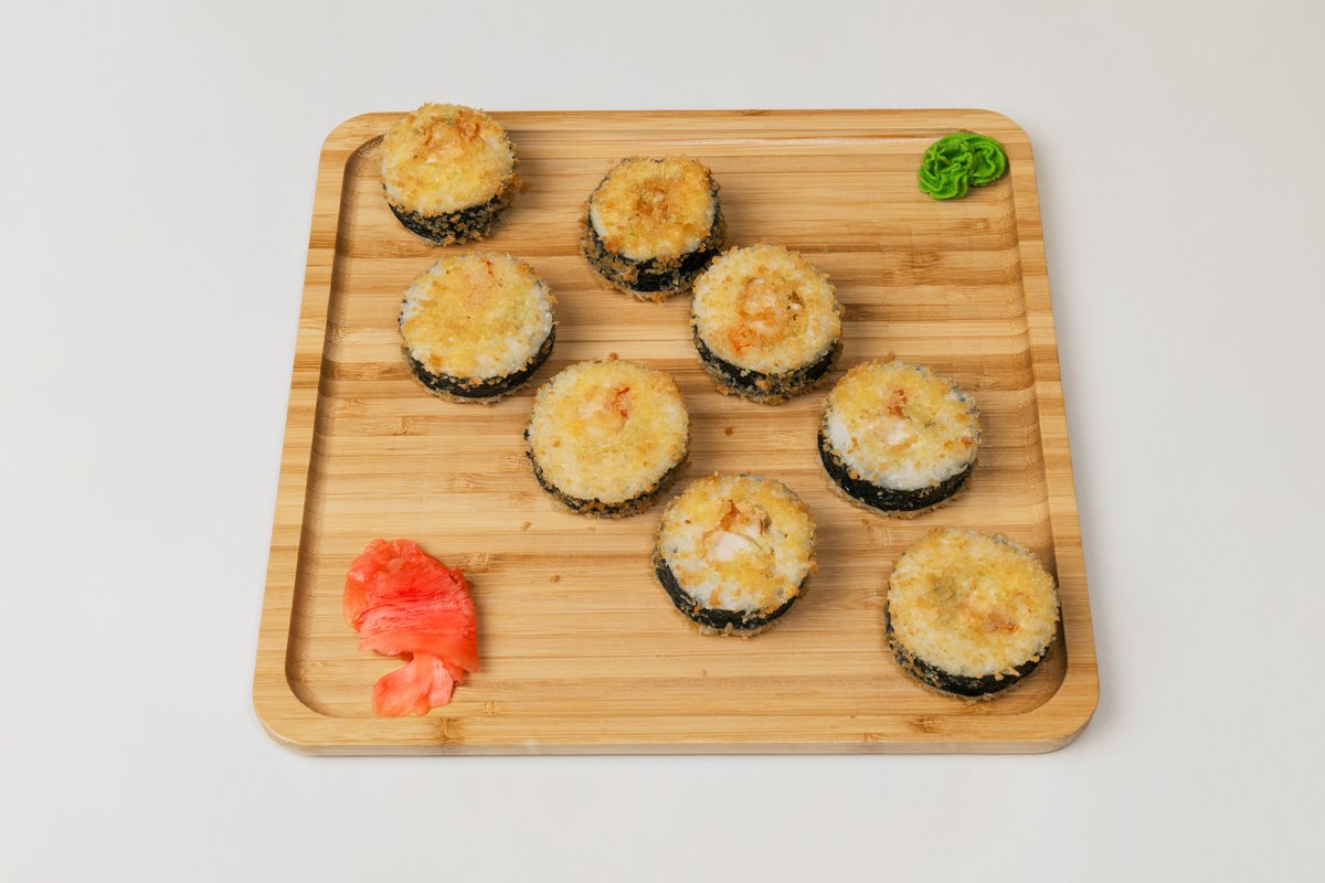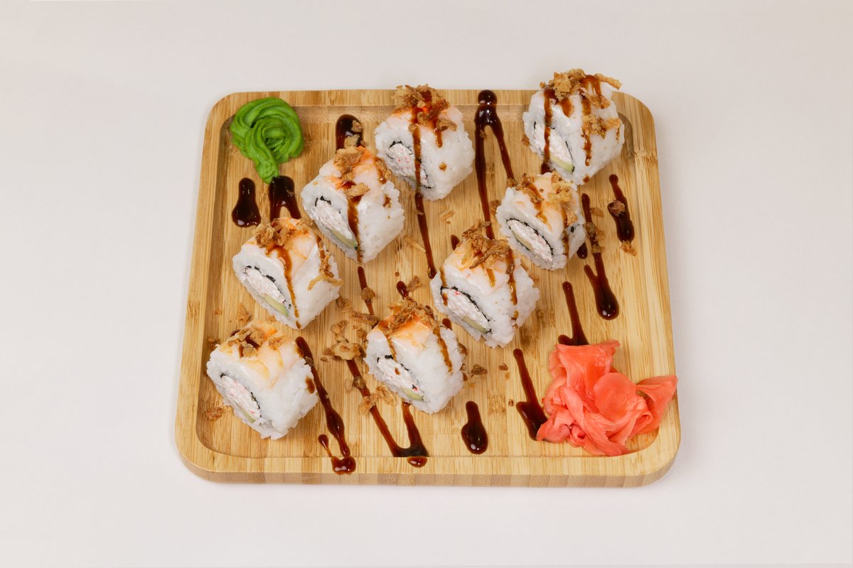 270g Pirinač, nori, surimi sa sirom, avokado, škampi, sos, prženi luk, 8 komada