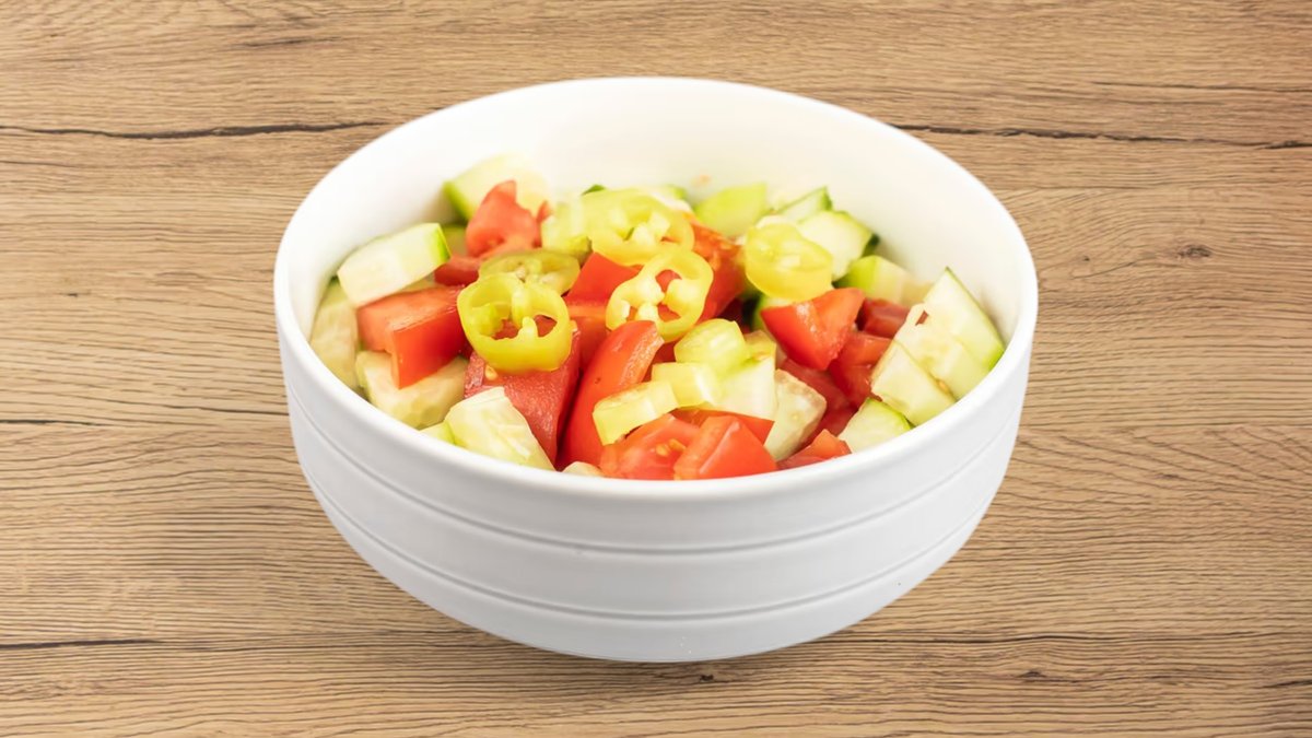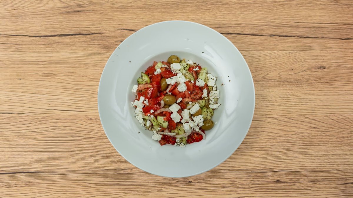 paradajz, krastavac, paprika, masline, crveni luk, feta sir