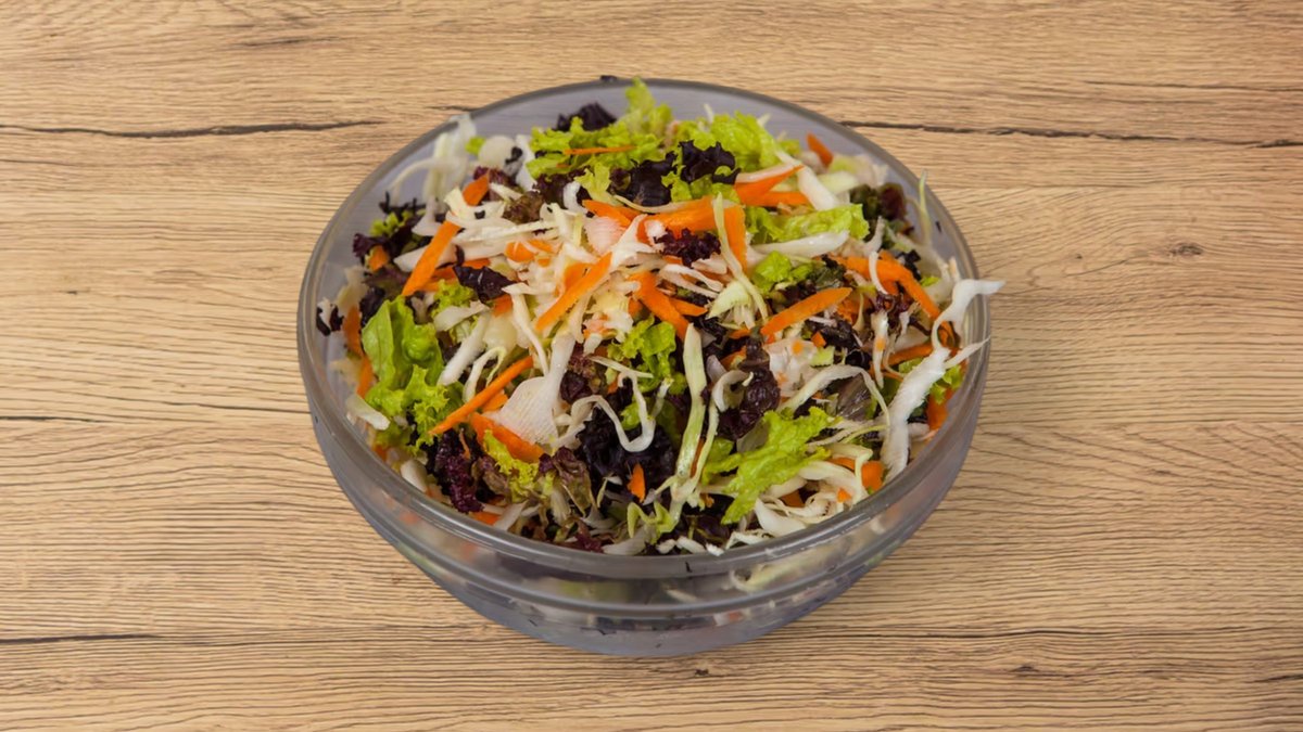 Mix zelenih, haus dresing, pomorandža segmenti, šareni susam, banana, indijski orah, hrskave lignje