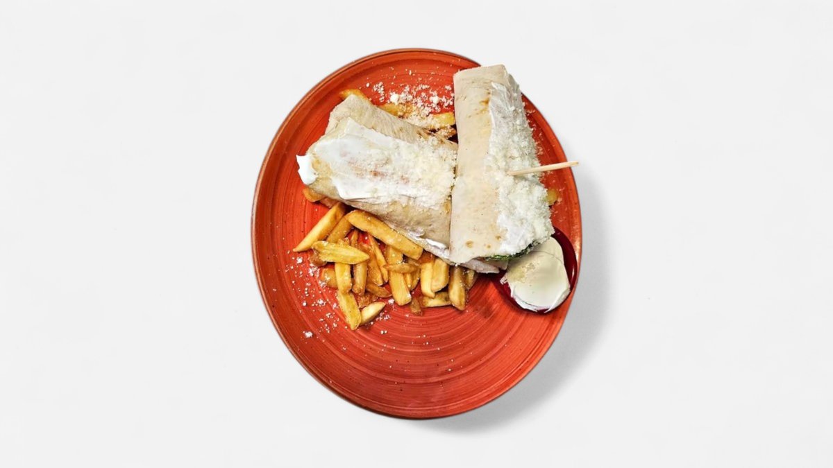Domaća tortilja, hrskava piletina, caciki sos, zelena salata, paradajz, pomfrit.