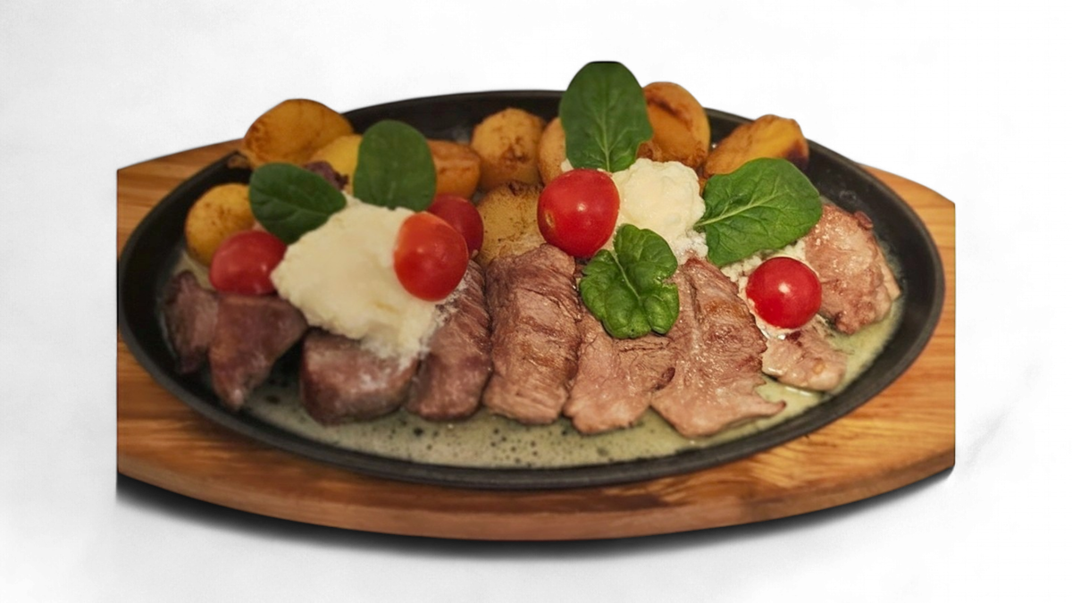 Domaća lepinja, paradajz, zelena salata, crveni luk, kajmak, dimljena butkica, ren sos, tostiran.