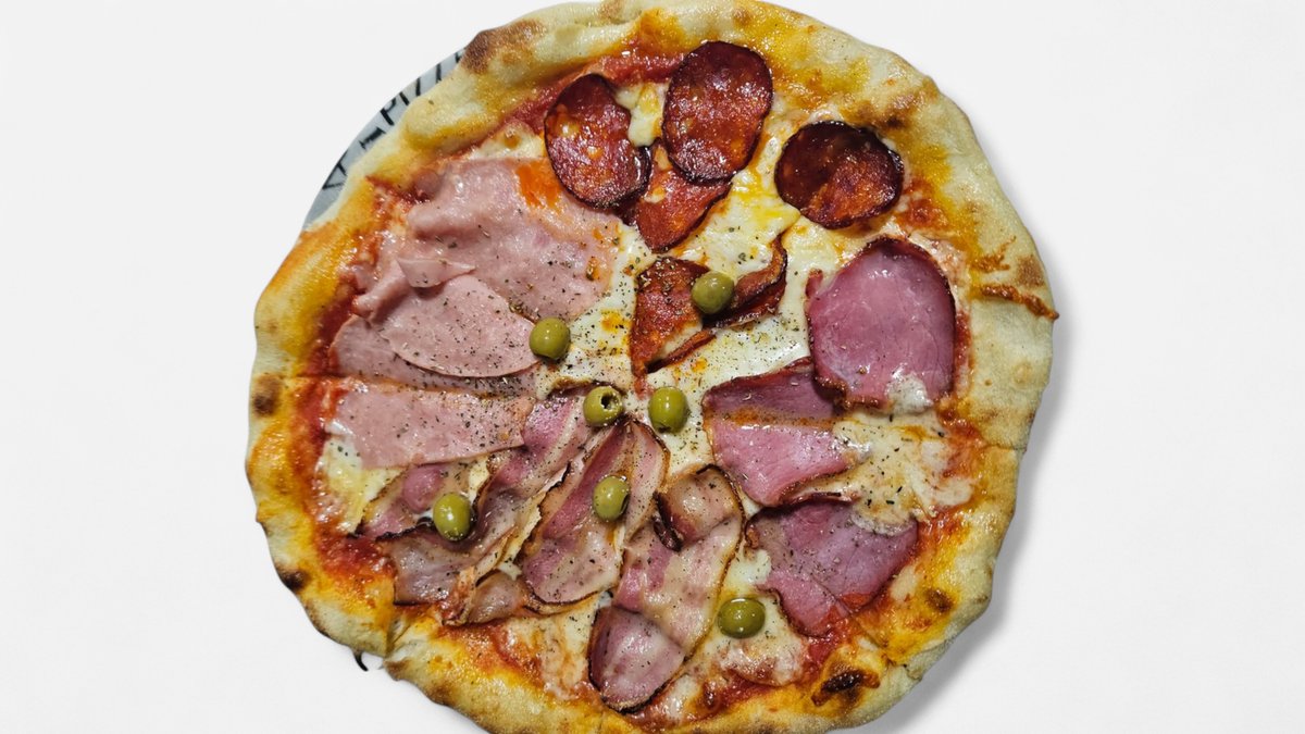 Pelat, mocarela, šunka, šampinjoni, origano, masline.