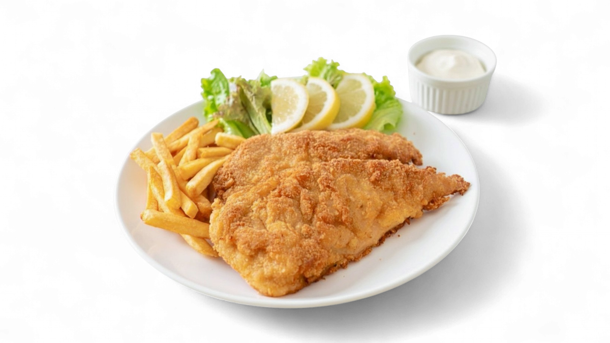 Pohovana piletina,paradajz,kupus,tartar sos ,pavlaka,kackavalj i pomfrit