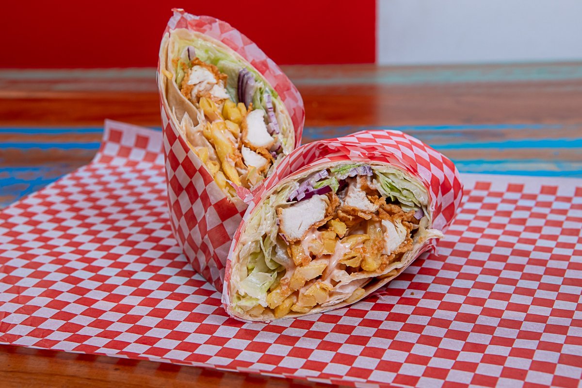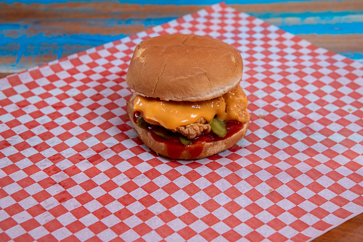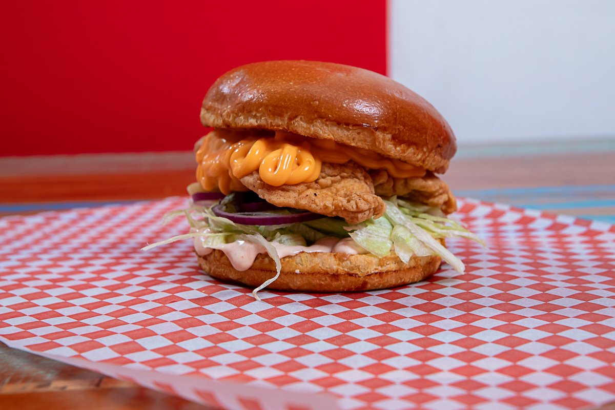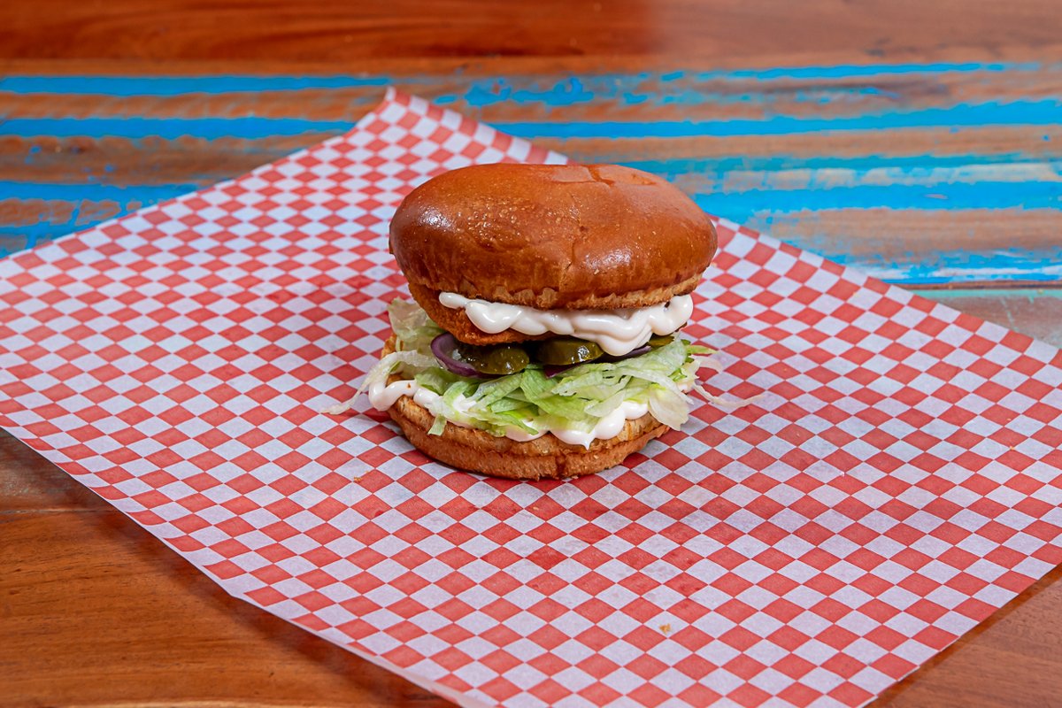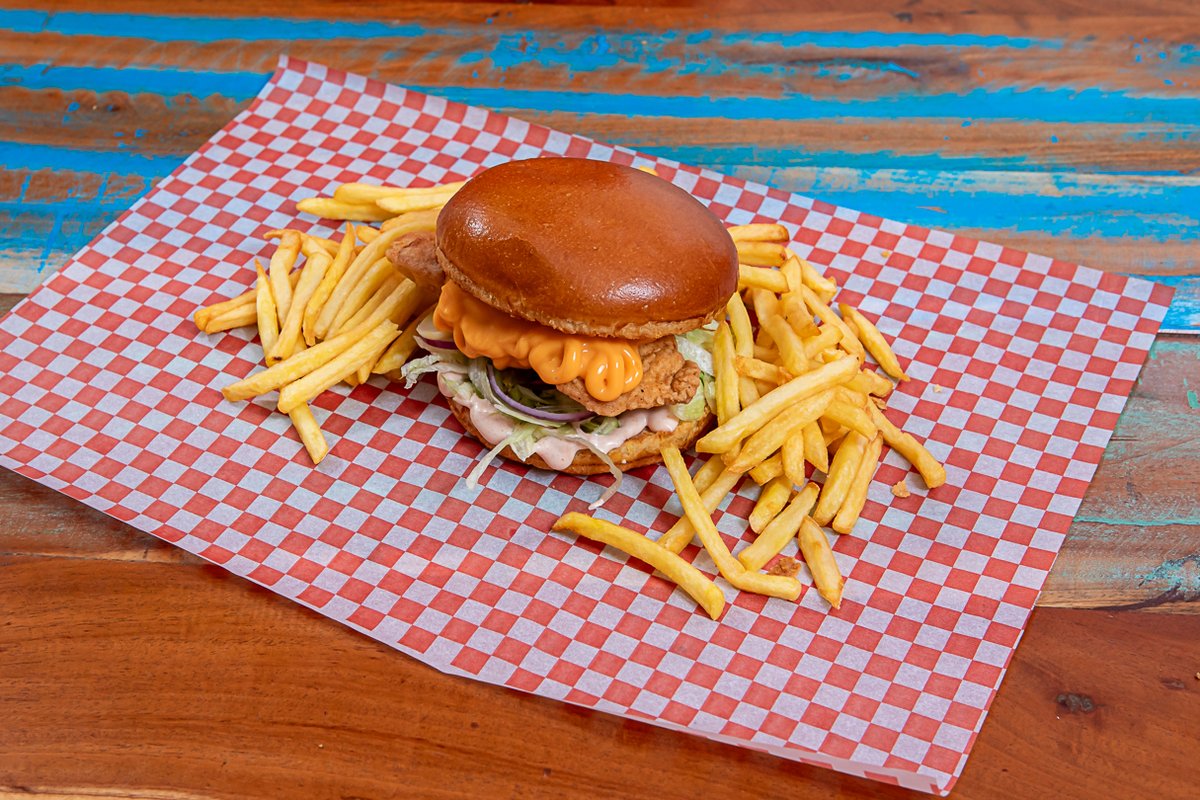 Panirani pileći file,iceberg salata,krastavčići,ljubičasti (ili crveni) luk,cheddar sir,burger sos/ ljuti sos.