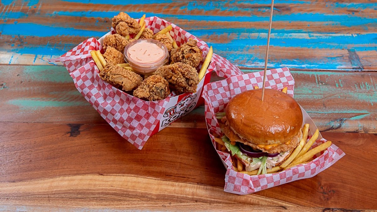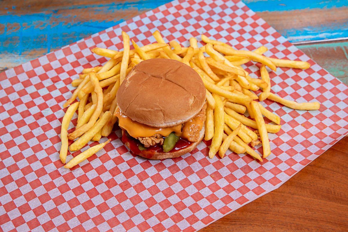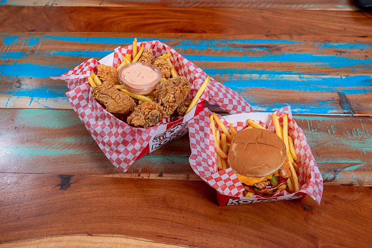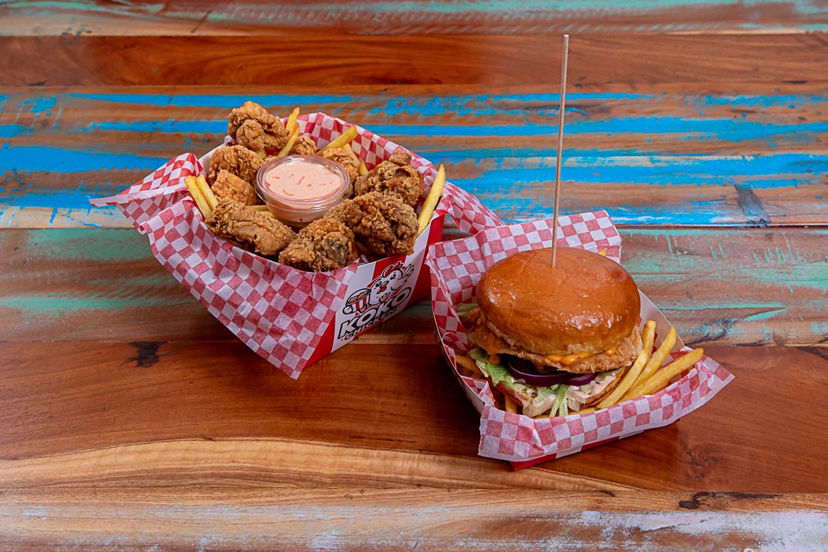 Chicken Cheeseburger, L Pomfrit, 3 kom Hrskava Pileća Krilca, 3 kom Chicken Niggets, Koko sos,Sok po izboru