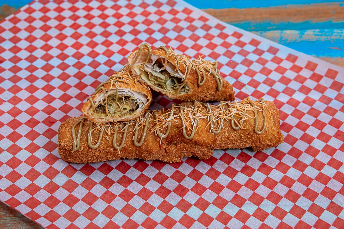 Panirani pileći file, krastavčići, cheddar sir, kečap
