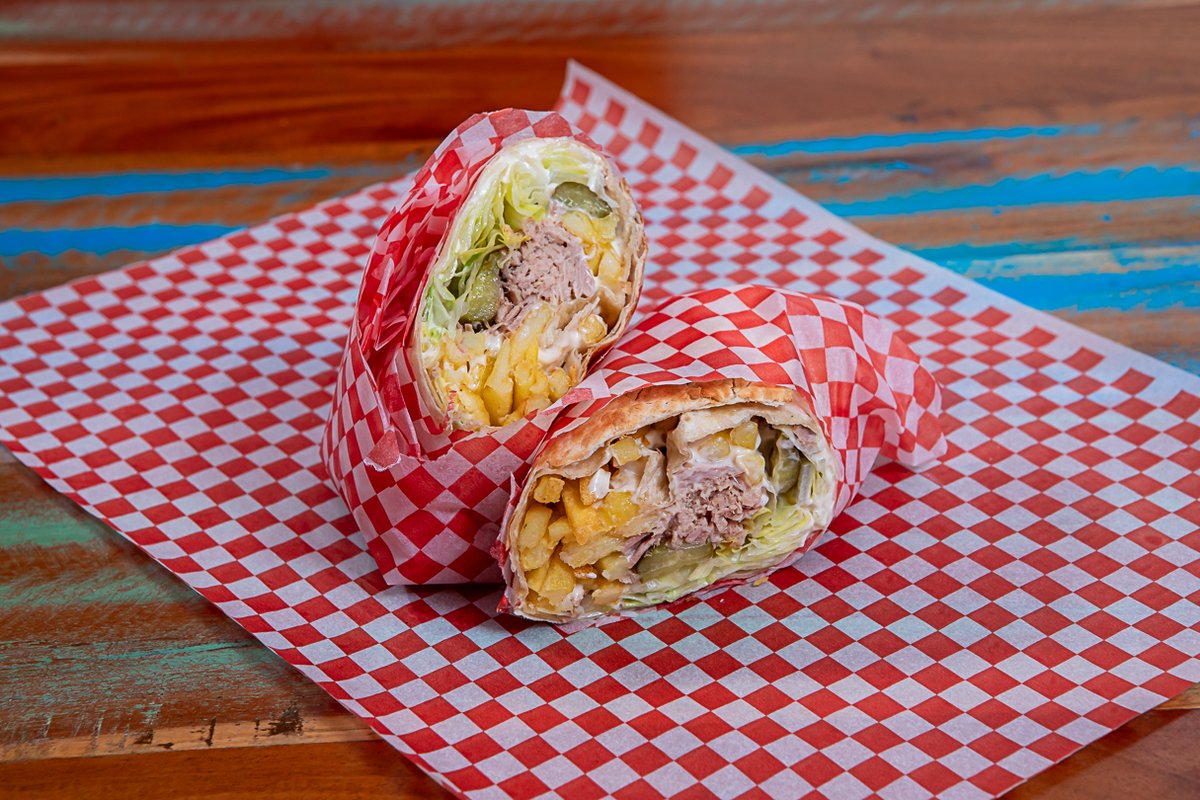 Tortilja,tuna u komadima, iceberg salata, crveni luk, majonez, krastavčići, pomfrit