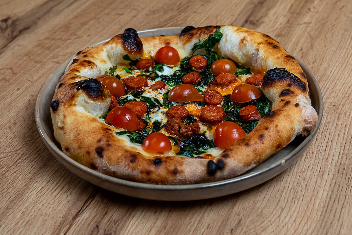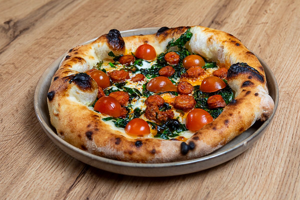testo, krema od parmezana, neutralna pavlaka i parmezan, mocarela, gorgonzola, dimljeni svinjski vrat, masline